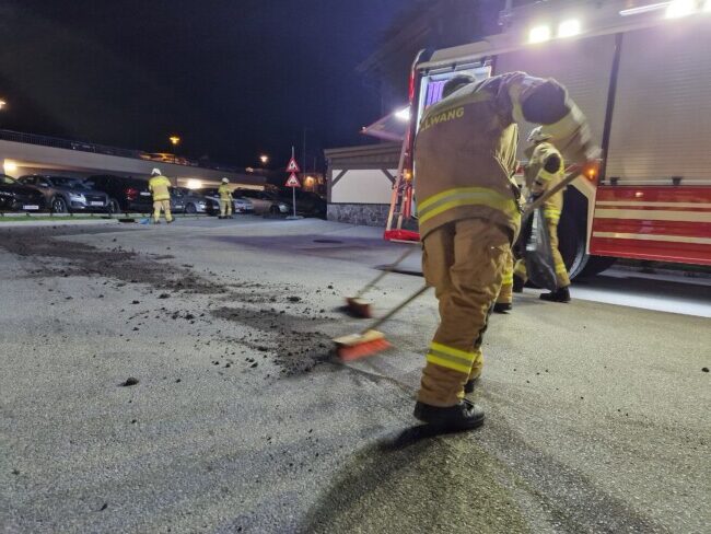 Beim Eintreffen der Feuerwehr Hallwang am Einsatzort wurde festgestellt, dass die Ölspur vom Pfarrhof bis zum Parkplatz des Veranstaltungszentrums reichte. Durch einen technischen Defekt eines PKW, traten mehrere Liter Betriebsflüssigkeiten aus. Da dieser Schaden vom Fahrzeuglenker nicht sofort bemerkt worden war, erstreckte sich die Ölspur auf eine Länge von ca. 100m. Durch die Feuerwehr Hallwang wurde die Ölspur gebunden und der Einsatz nach einer knappen Stunde beendet. Das betroffene Fahrzeug wurde bereits vor Eintreffen der Feuerwehr abgeschleppt.
