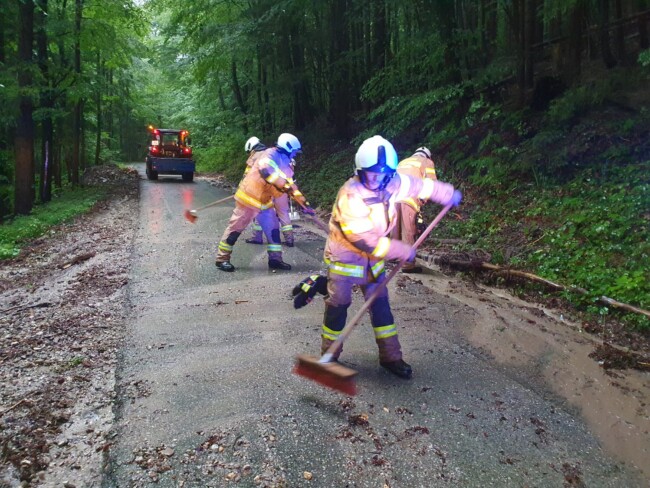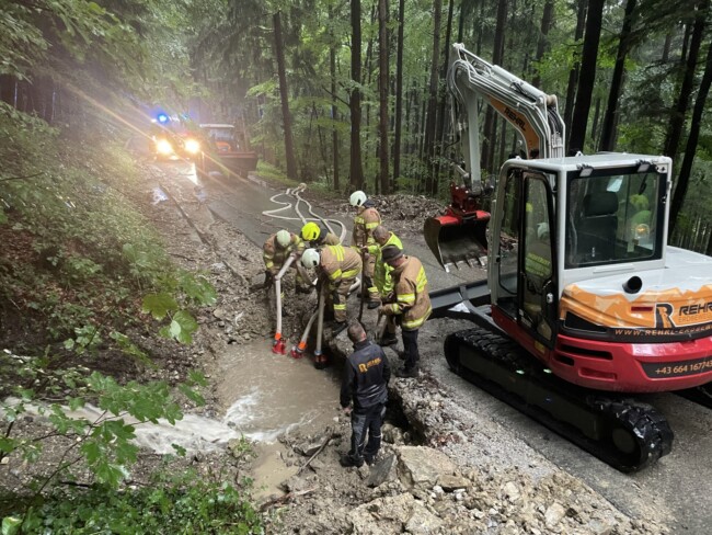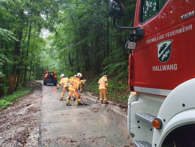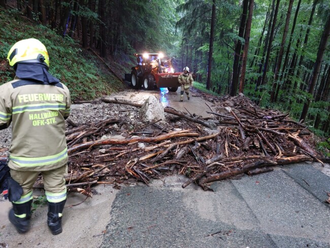 Gemeinsam mit Mitarbeitern des Bauhofes Hallwang und unter Zuhilfenahme des kommunalen Frontladers konnte die Fahrbahn wieder frei geräumt werden. Für die Beseitigung der Verklausung wurde ein Erdbewegungsunternehmen mit einem Bagger angefordert. Nach mehreren Stunden schweißtreibender Arbeit konnte ein normaler Abfluss des Wassers wiederhergestellt werden.
