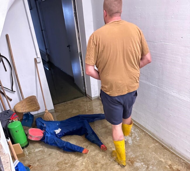 Parallel zum laufenden Einsatz stellten in Bereitschaft verbliebene Feuerwehrmitglieder fest, dass es im Feuerwehrhaus Hallwang zu einem Wassereintritt im Keller gekommen war. Auch dieser Einsatz gestaltete sich etwas aufwändiger. Nach Auspumpen des Kellers wurde ein verstopftes Kanalrohr als Ursache ermittelt. Mit eigenen Mitteln konnte der Rückfluss des Wassers nicht gestoppt werden. Durch die Leihgabe eines Rohrdichtkissens von der Feuerwehr Henndorf gelang es schließlich den Wassereintritt zu stoppen.